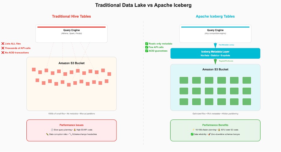 Traditional data lake formats like Apache Hive organized data into folders on cloud storage (like Amazon S3). When a query engine needed to find relevant data, it had to list every folder and file, one by one. For a table with thousands of partitions, this meant thousands of API calls just to figure out where the data lived before reading a single row. Worse, there were no guarantees that someone else wasn’t writing to the same table at the same time, potentially corrupting results.