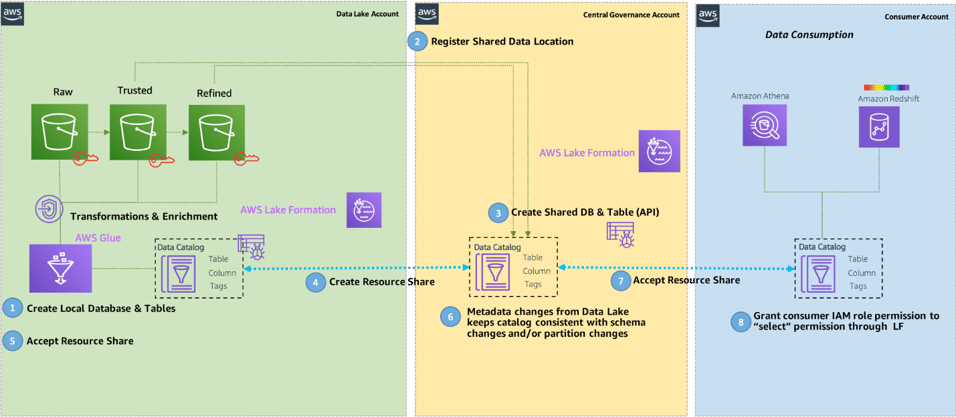 b. Share databases/tables cross-account through Lake Formation (AWS RAM under the hood), with the correct cross-account version settings.